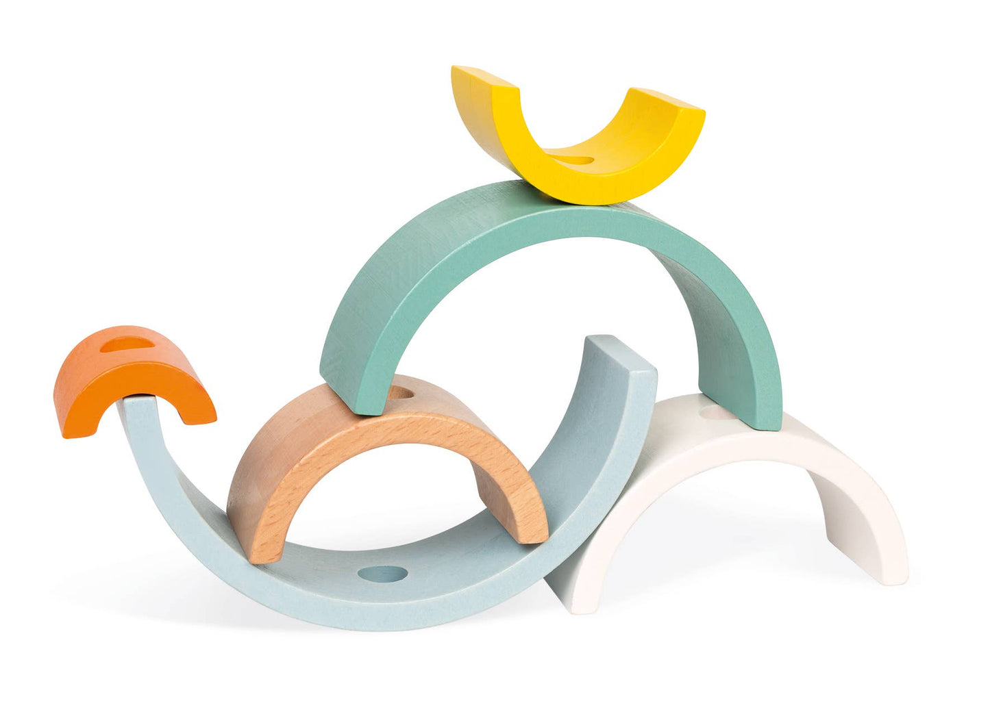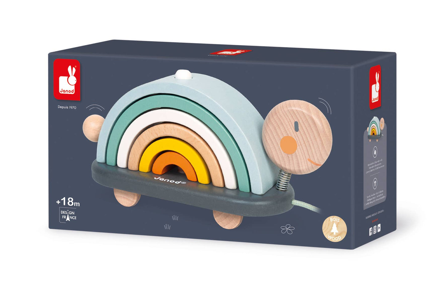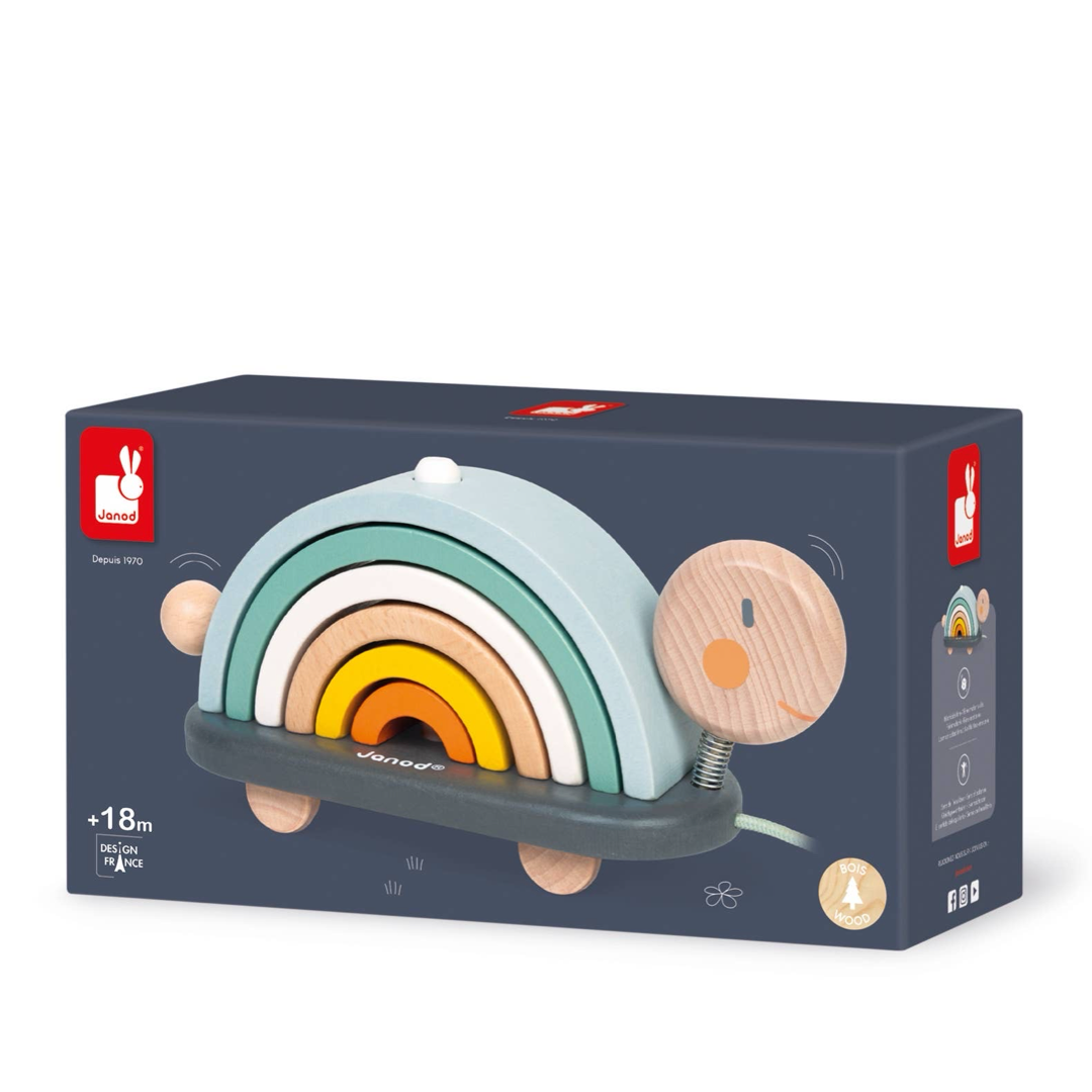 Take it for a walk with the attached string, or stack and build the rainbows to form an original construction game.