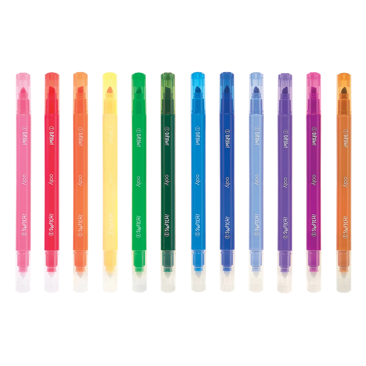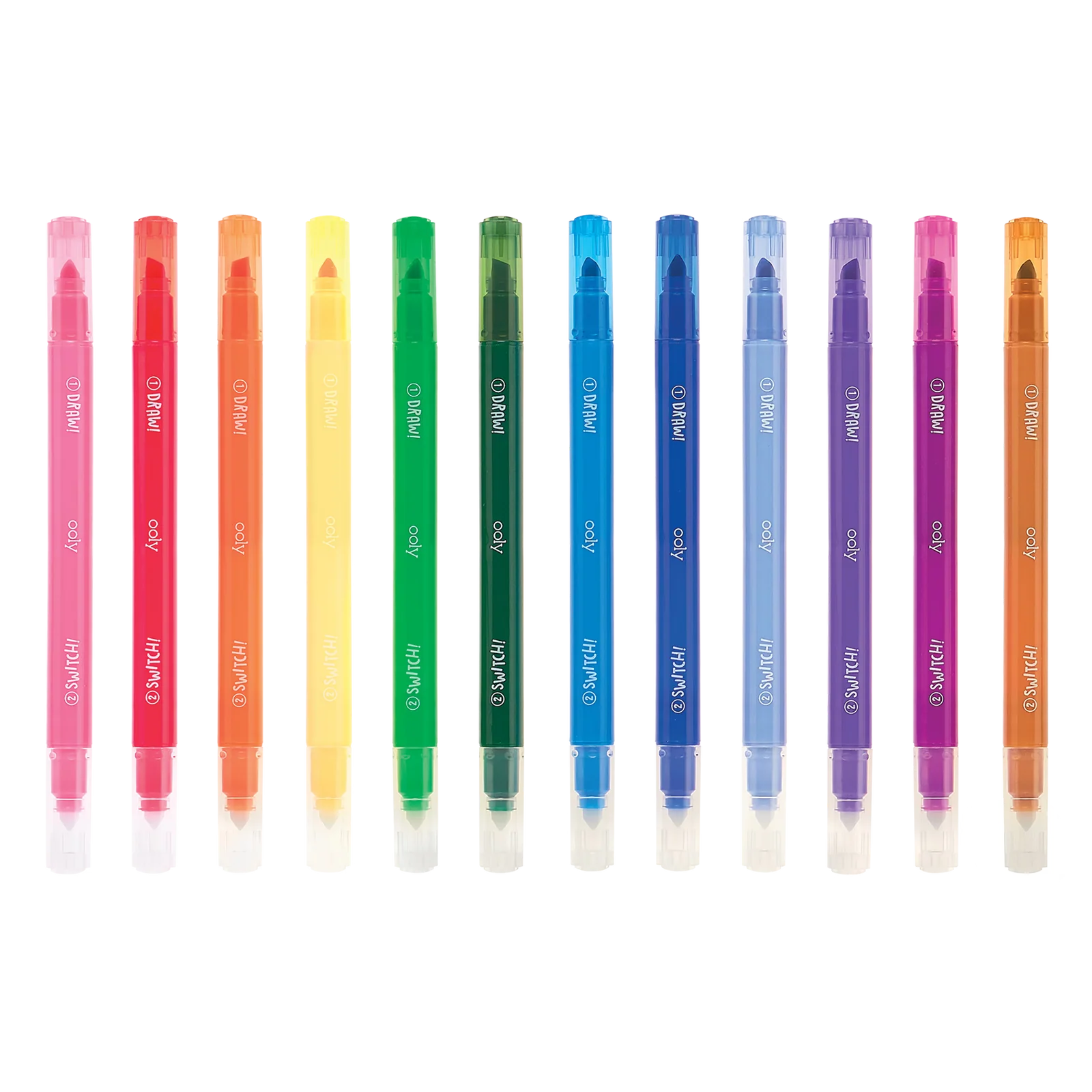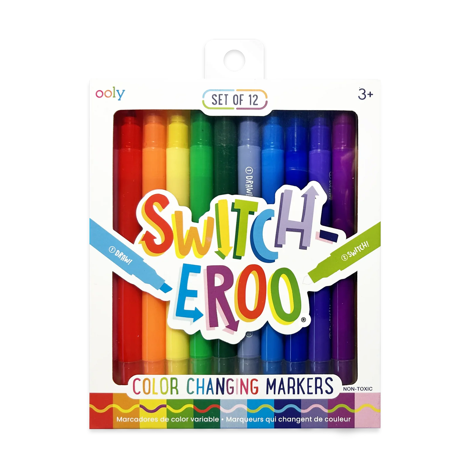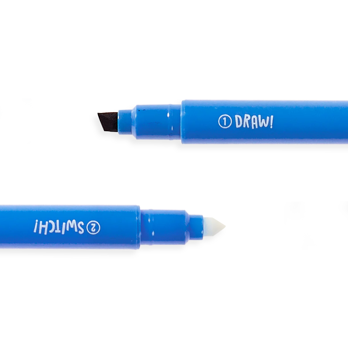 Switch-eroo Color Changing Markers are a set of 12 chiseled tip color markers. First draw with the colored tip, then use the white tip to switch it up!