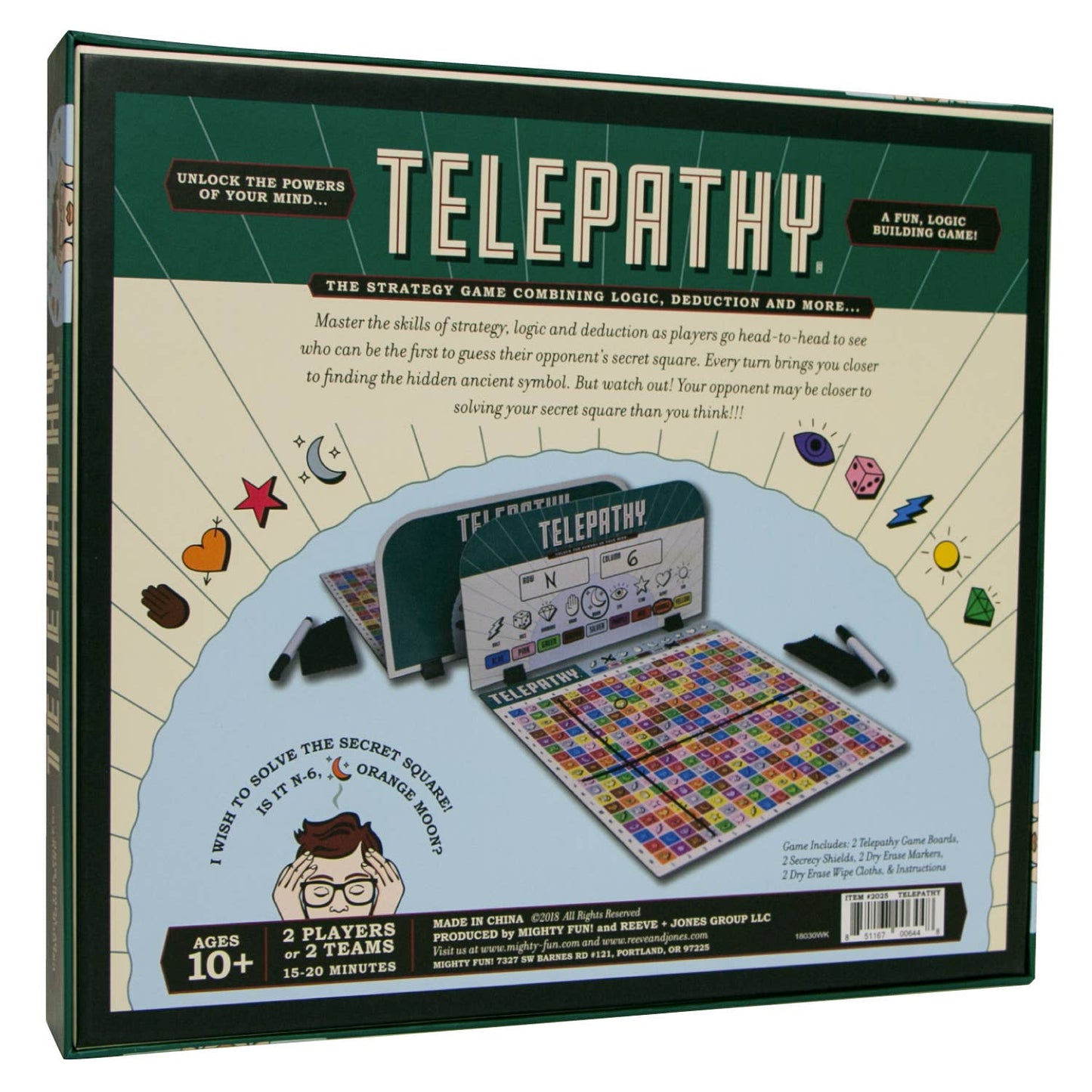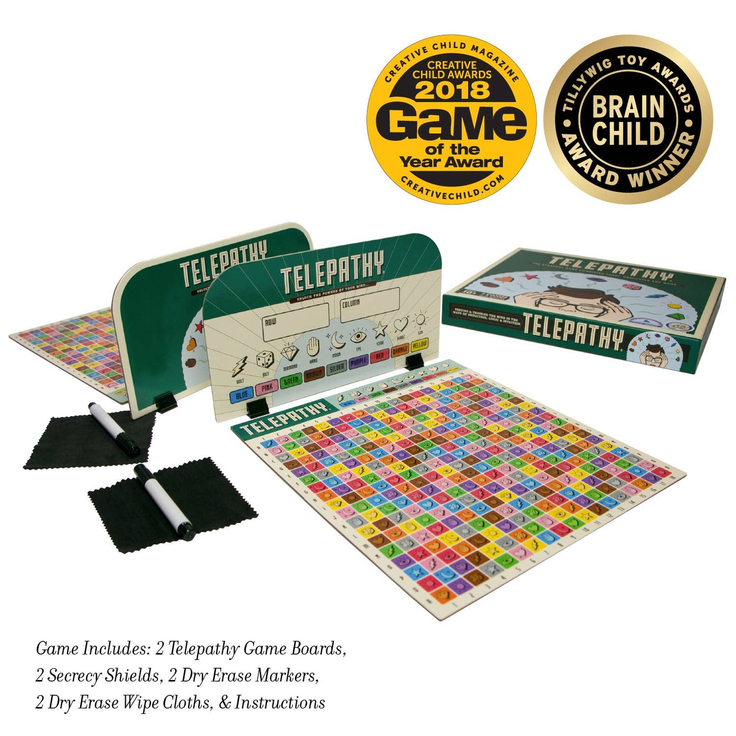 - Includes: 2 Telepathy® grid boards, 2 secrecy shields with stands, 2 dry erase pens, 2 dry erase wipe cloths, rulebook.