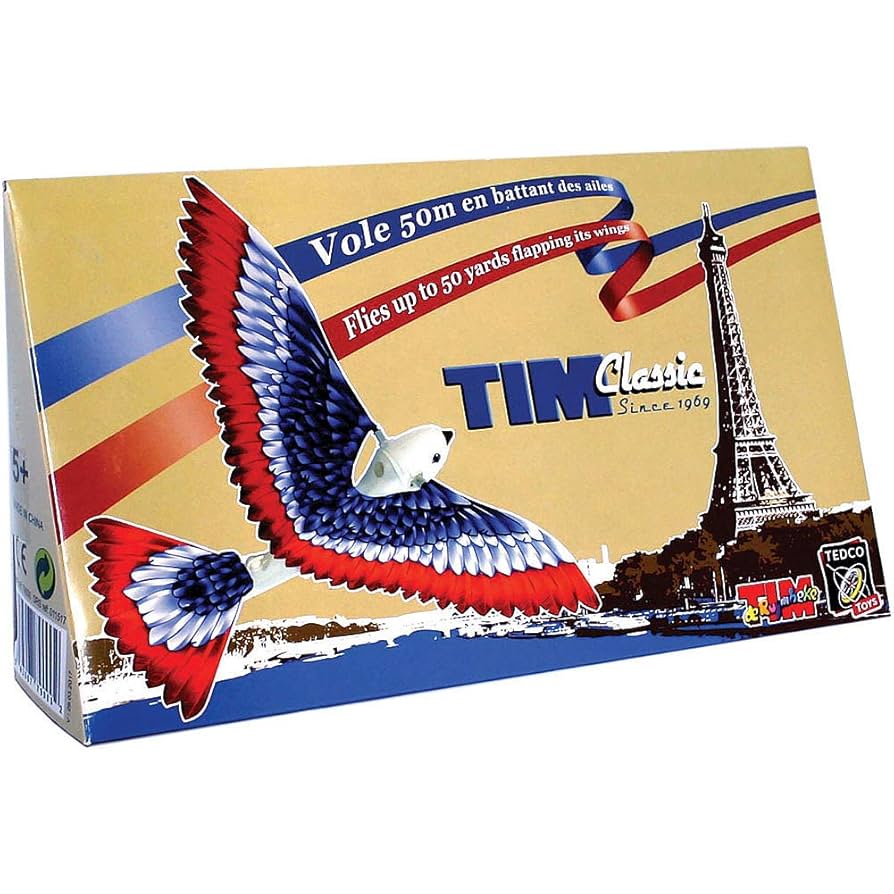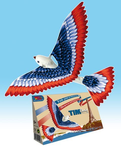 Tim Bird Classic Ornithopter The original flying bird that flaps and soars! Watch Tim Bird glide through the air with real flapping wings—flying up to an impressive 50 yards! Originally designed in France in 1969, this classic ornithopter remains a timeless favorite for kids and collectors alike. Simply wind it up and let it soar!