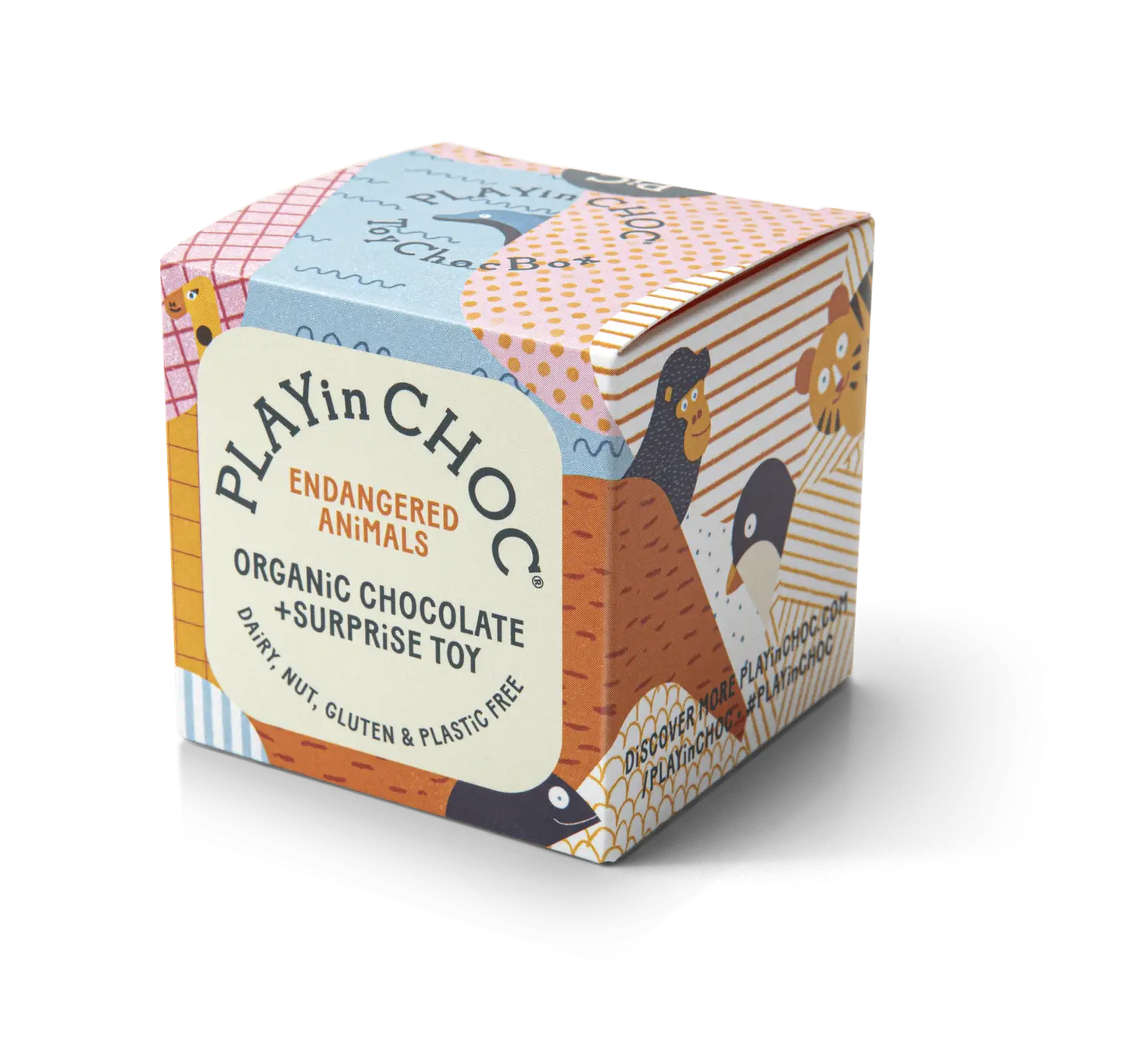 PLAYin CHOC® ToyChoc Box® contains 2 x 10g individually wrapped, deliciously creamy, organic, dairy-free chocolates and a delightful card toy to assemble. The toy is one of a collection of 18 to collect and also comes with its own fun facts card.