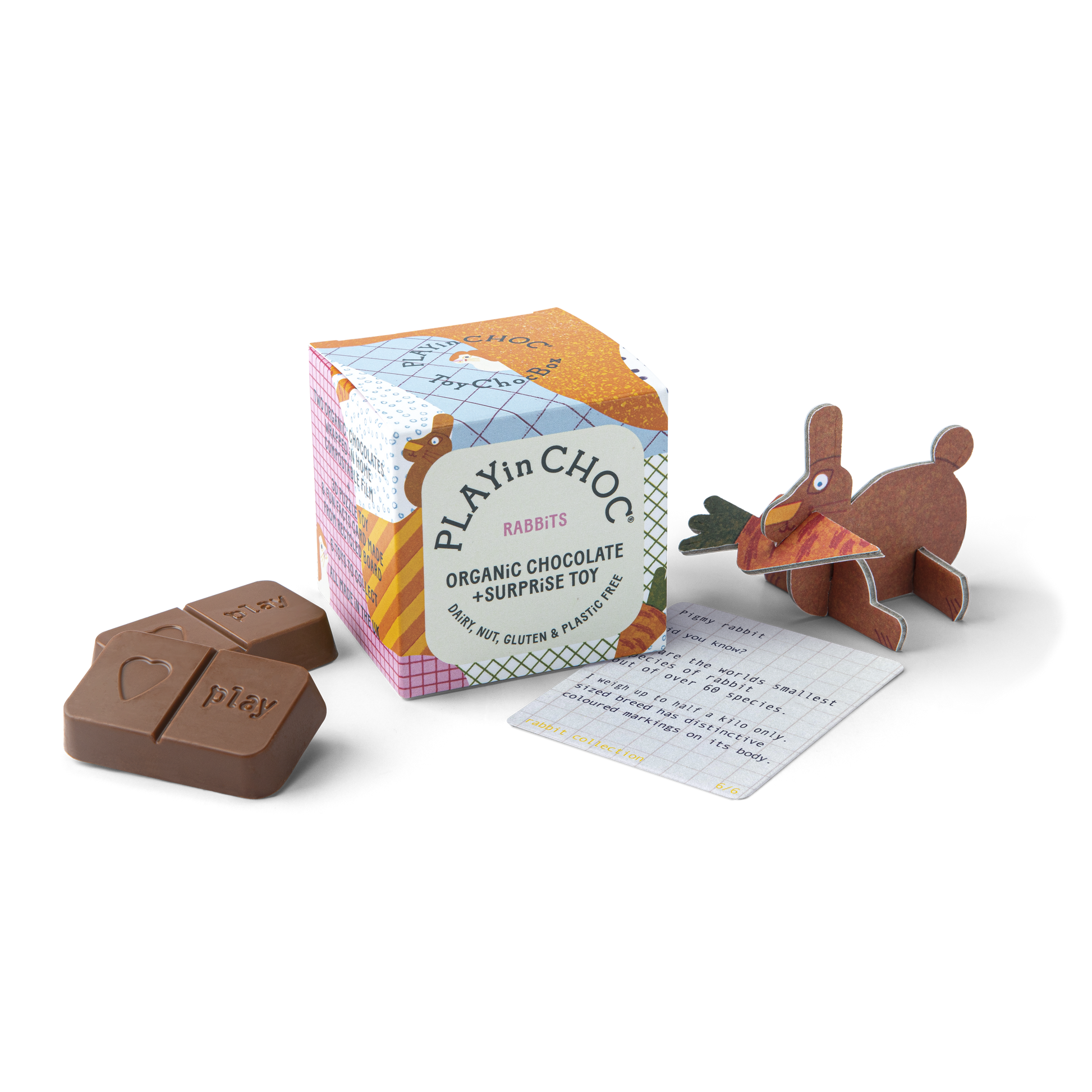 With each ToyChoc RABBiT box, you get a cool paperboard rabbit to assemble and collect along with two (2) pieces of delicious vegan milk chocolate!