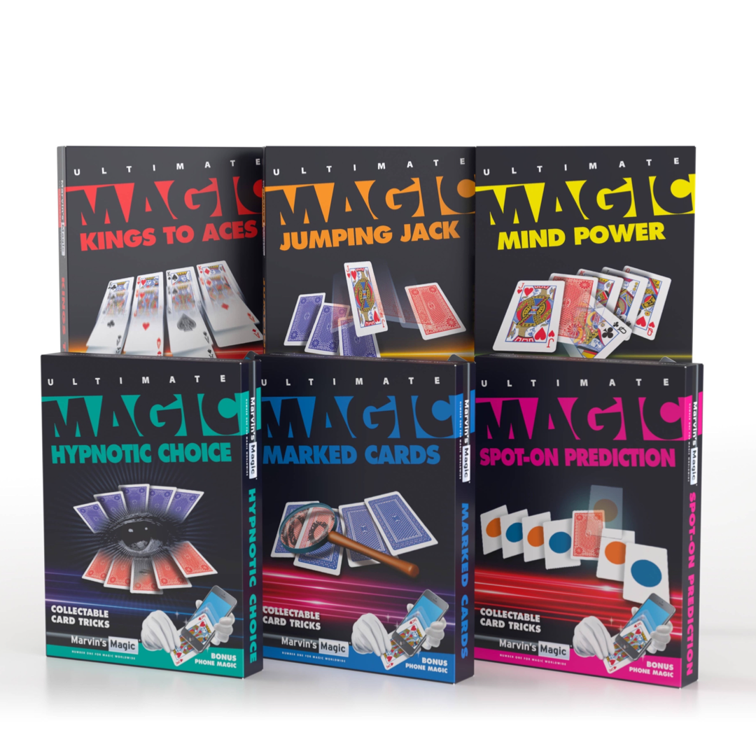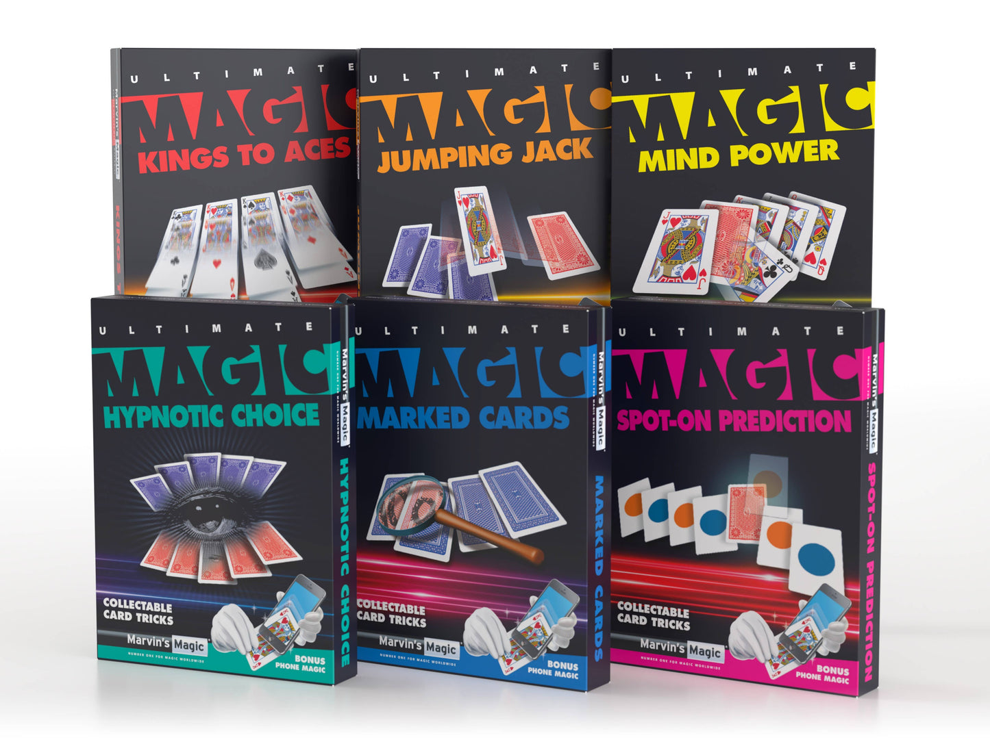 Unwrap some magic season with these Card Magic Trick Packs! This collection of collectible tricks features playing cards and magic cards, including beloved classics like Kings to Aces, Jumping Jack, Hypnotic Choice, Marked Cards, and Spot-on Prediction as well as mind-boggling phone magic tricks that can be performed using our app.