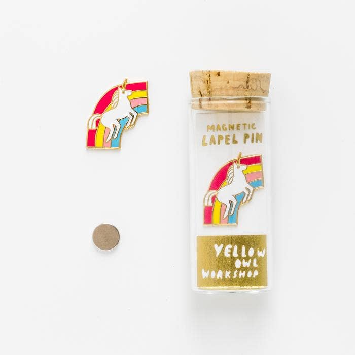 Our luxury-quality 22-karat gold gilt lapel pins are decked with vivid cloisonné colors and have a magnetic backing. Delicate enough (and damage-free!) for your favorite tops but with magnetic strength that allows them to be worn on even heavy-weight denim. Comes packaged in our unique glass vial packaging with cork.
