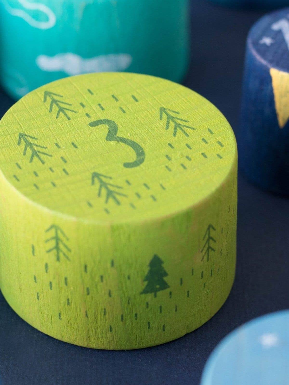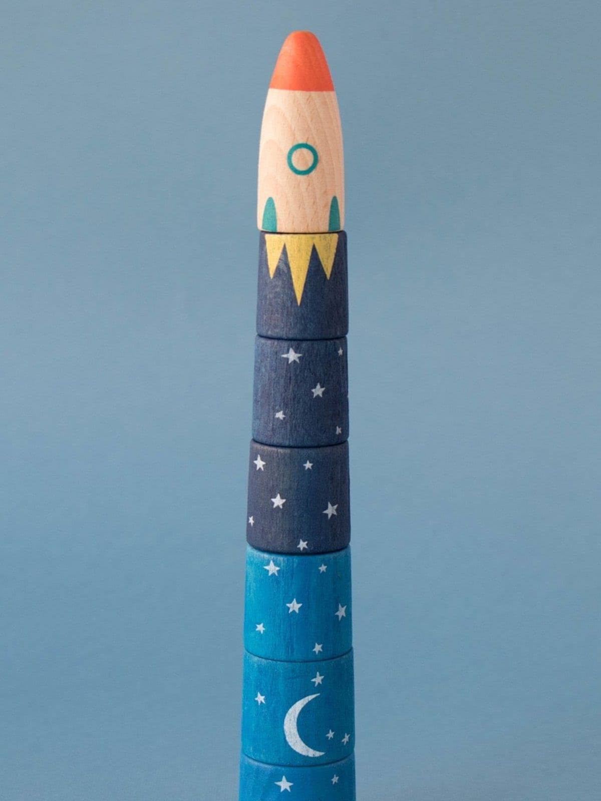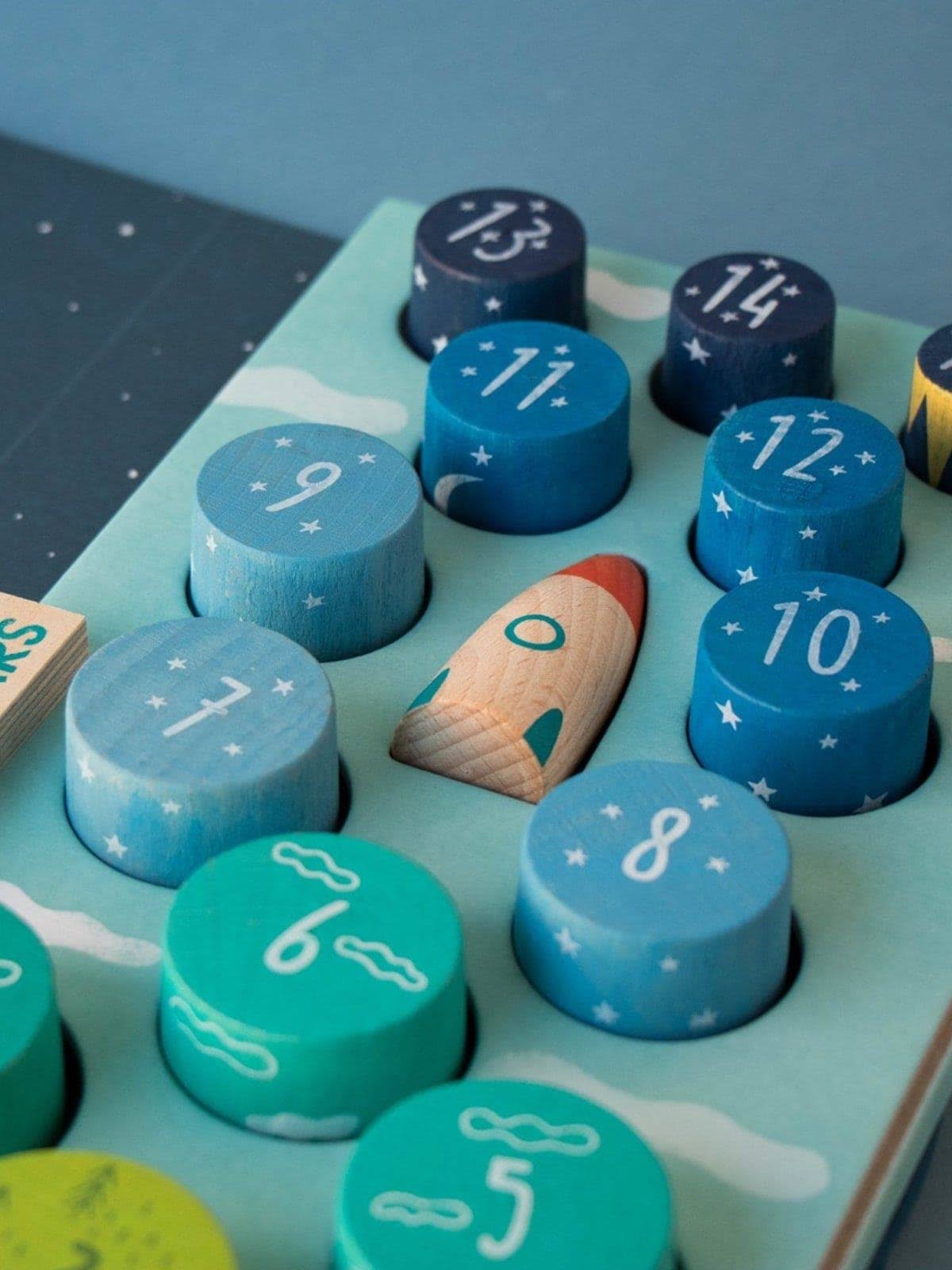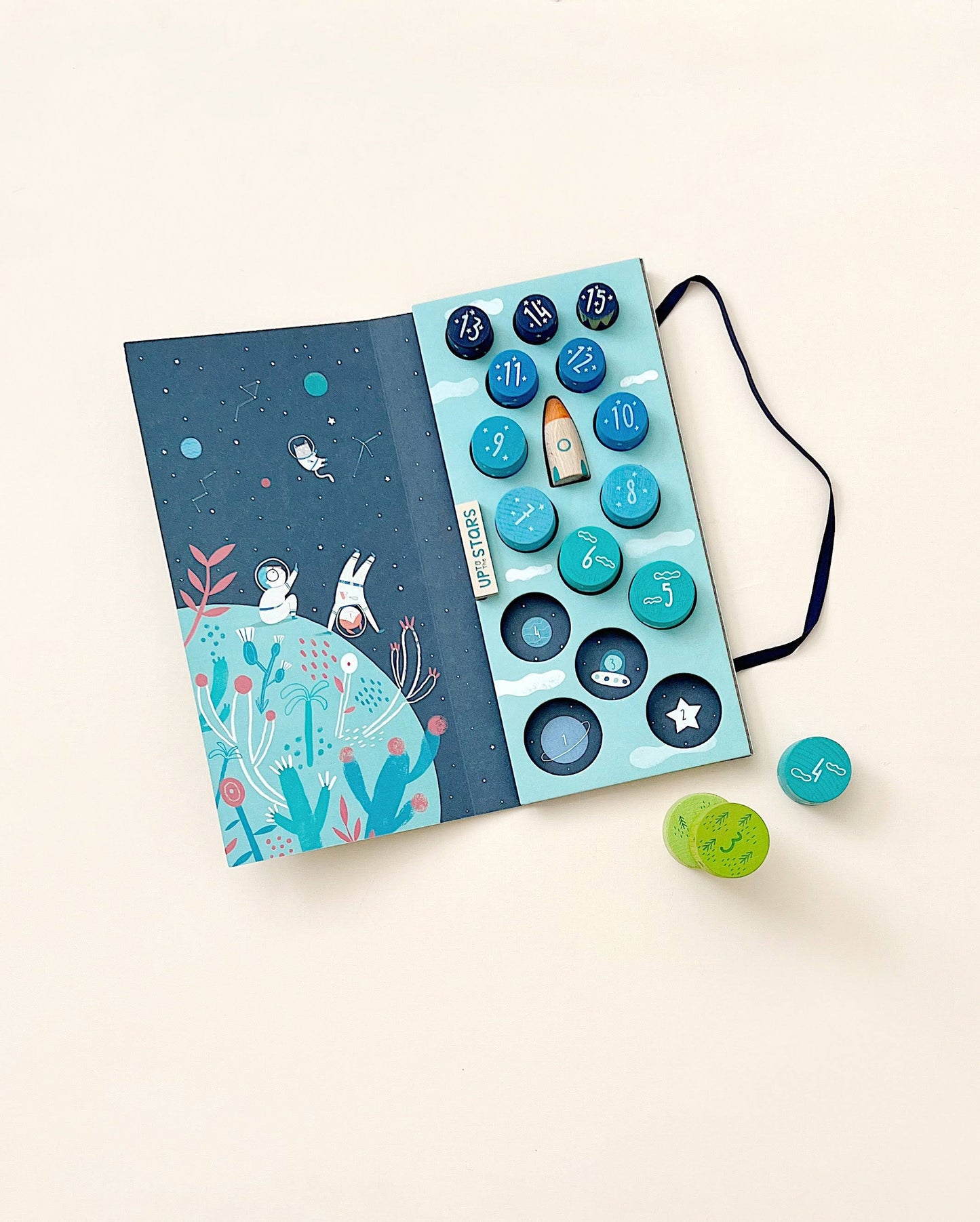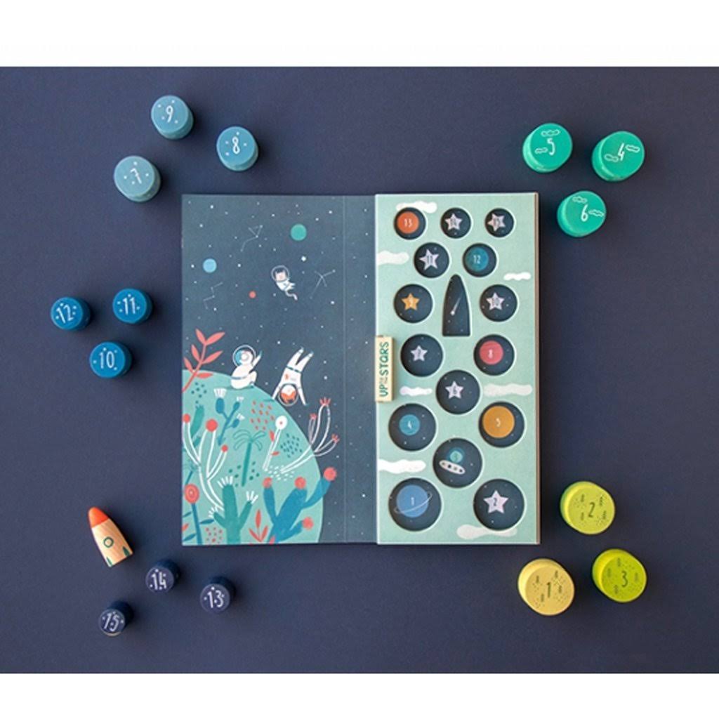 LONDJI Up to The Stars is a beautifully designed wooden game that is designed and made in Spain. A beautifully designed and vibrantly colored counting game lets kids stack pieces to get the space ship "Up to The Stars". 16 wooden pieces are packed in a die cut package made of high quality matboard with an elastic closure for easy storage. Game easily slides into a bookshelf.