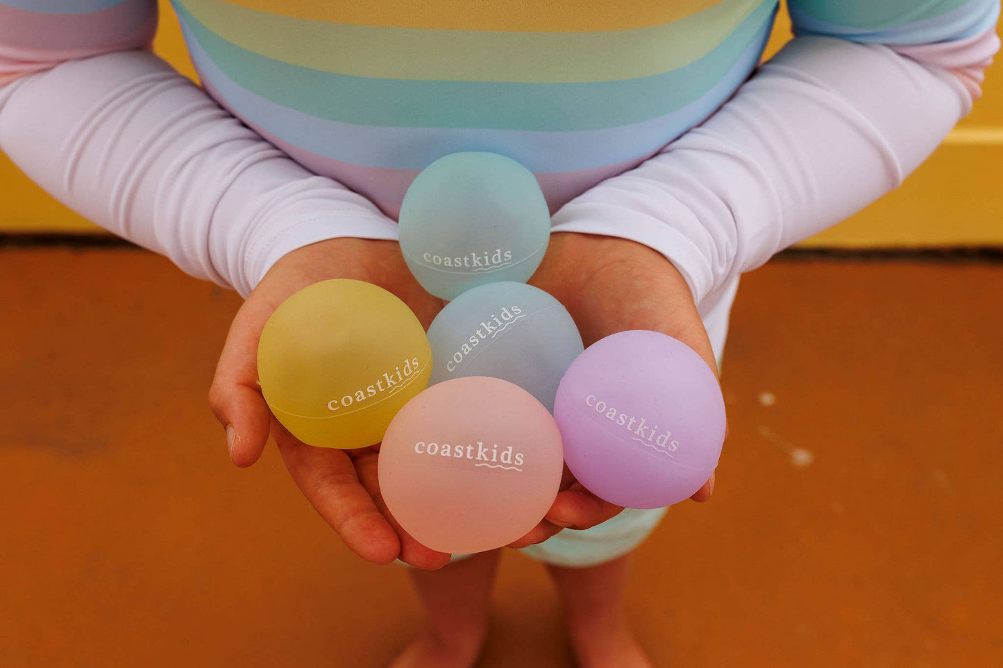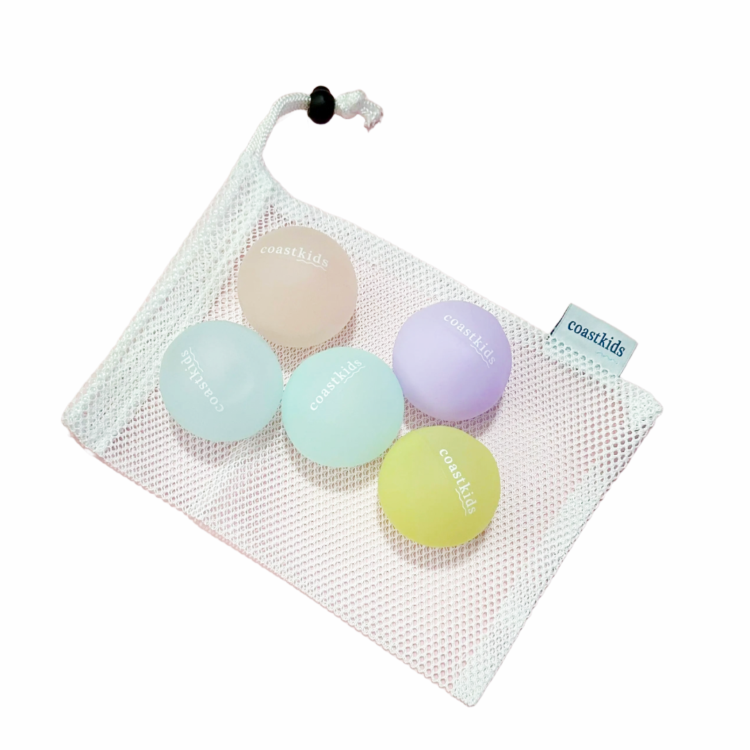 A handy pack of five reusable, self-sealing, silicone water balls. They are packed inside our white net bags made from recycled plastic bottles. Simply dunk them in water and throw for endless fun in the sun. These water balls are magnet free and made from silicone.