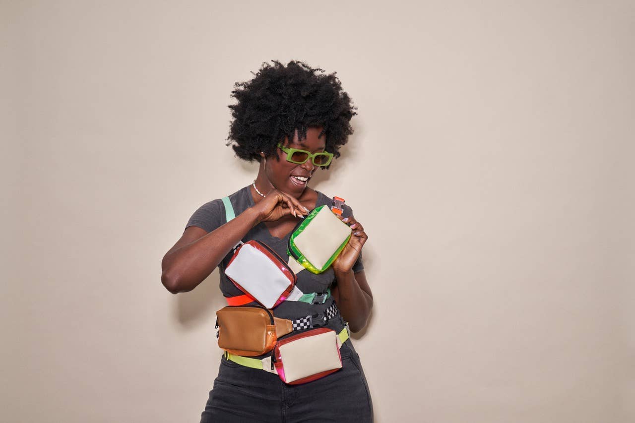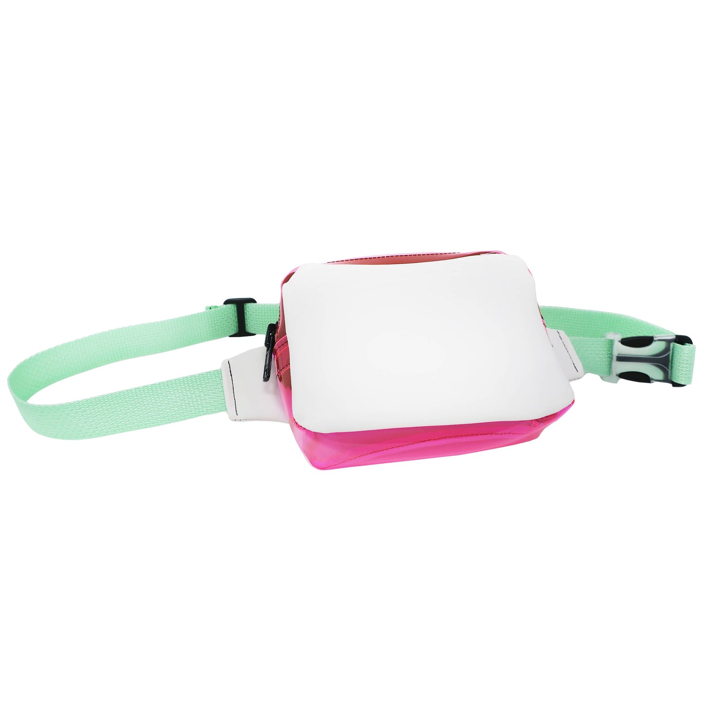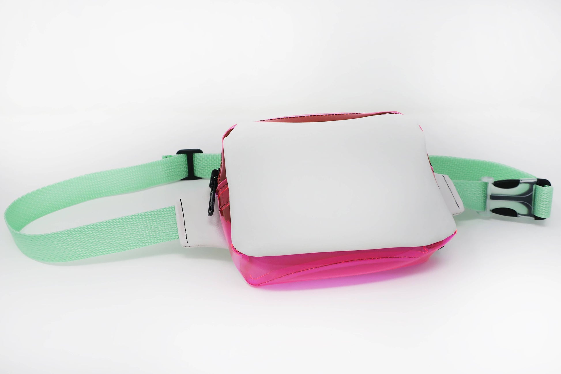 Around your waist or around your body -- this fanny pack is perfectly sized to hold all your essentials on the go! White vegan leather and pink transparent vinyl with a mint green 1" wide adjustable strap will have everyone asking you, "Where the f*** did you get that fanny pack?!" Completed with black and clear plastic hardware!