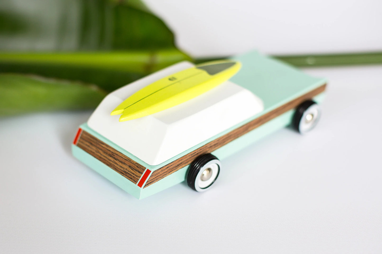 The famous classic, now in a boxier 80's vibe. With real veneer-paneled sides, and a magnet embedded in the roof, it comes with a surfboard that snaps onto it. This car also features a magnetic tow hook - allowing it to hitch to our equally awesome trailer.