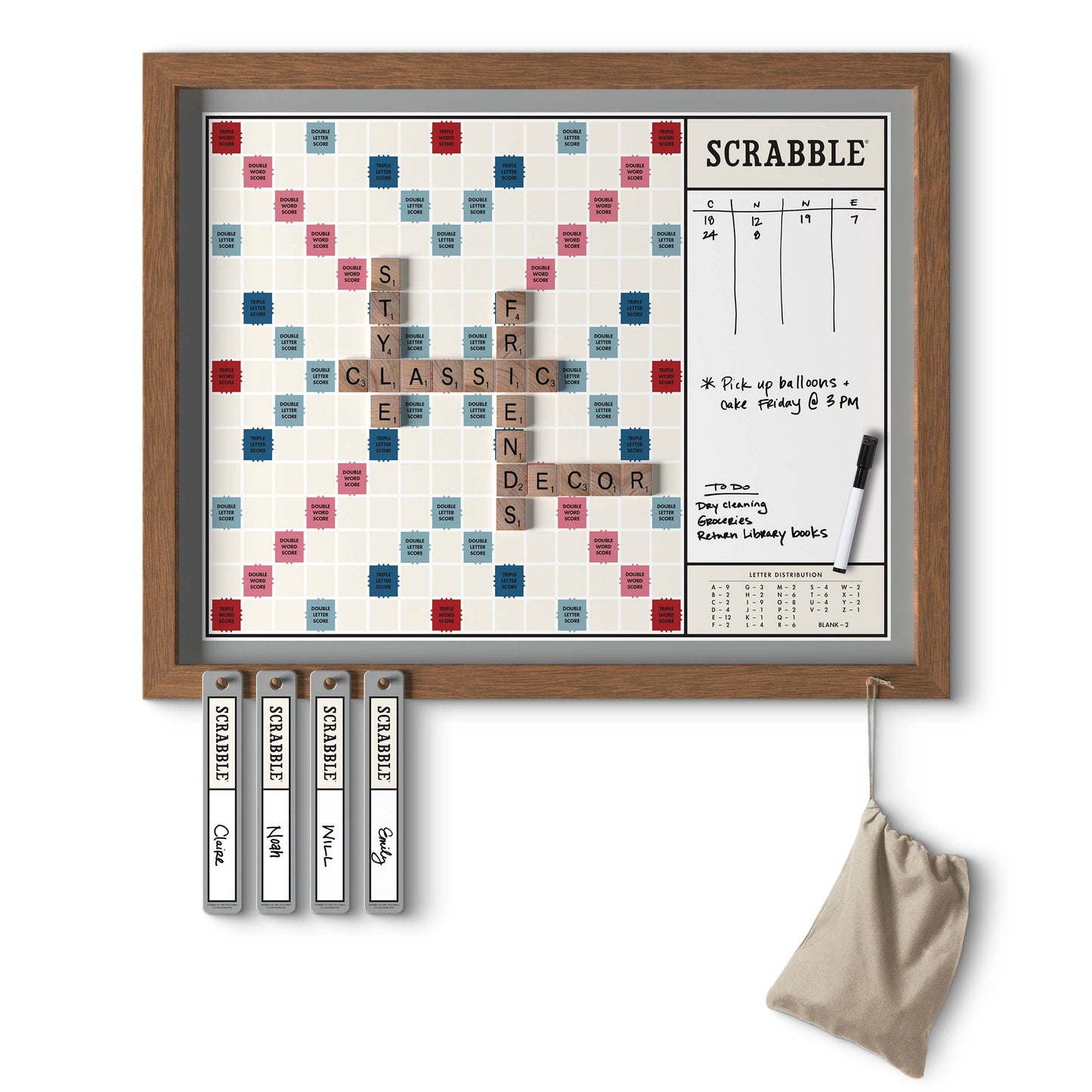 A super fun way to play Scrabble! Hang the board up and take your turn as you pass by. Your letters wait for you on your tile rack, hidden from your opponents, waiting for your next move. Use the memo board on the side to keep score, leave a note, or jot down a list!